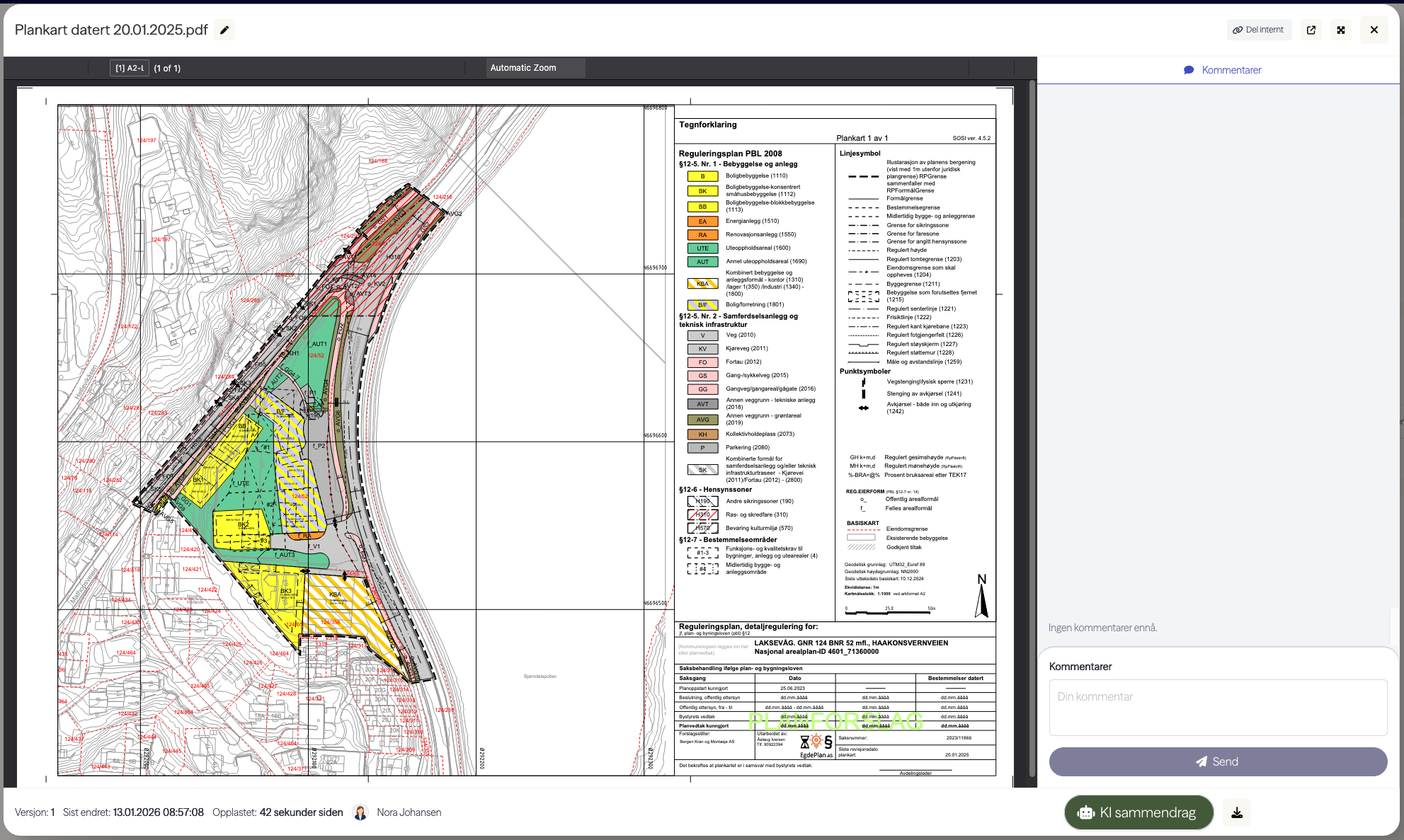 Brukerne i prosjektet kan legge til kommentarer på alle filer i Planeo. For å legge til en kommentar åpner du en fil. På venstre side vises en forhåndsvisning av filen, og på høyre side finner du en oversikt over alle kommentarer. Hvis en fil er, eller har vært, tildelt en resultatmappe, vises det to faner på høyre side: én for "Kommentarer" og én for "Kvalitetssikring".