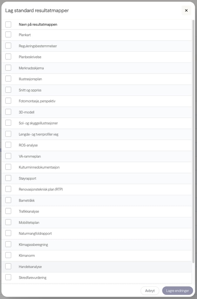I fanen Planmateriale kan du opprette resultatmapper for hver fase. Disse hjelper deg med å holde oversikt og over alle dokumentene som skal leveres til kommunen.