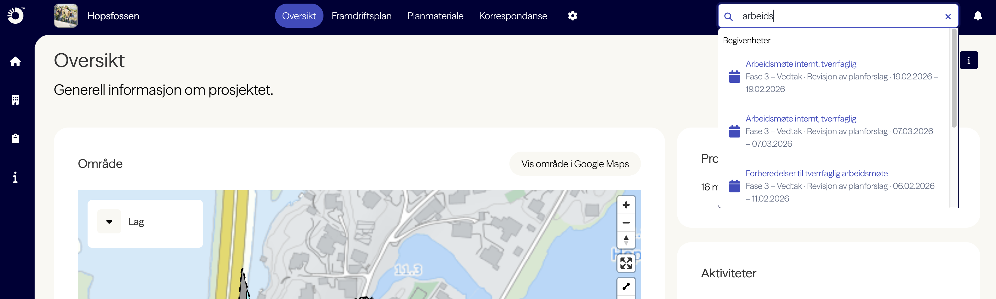 Søk og finn filer, begivenheter, underphaser, resultatsmapper, beslutninger, korrespondanse-oppfølging og team medlemmer